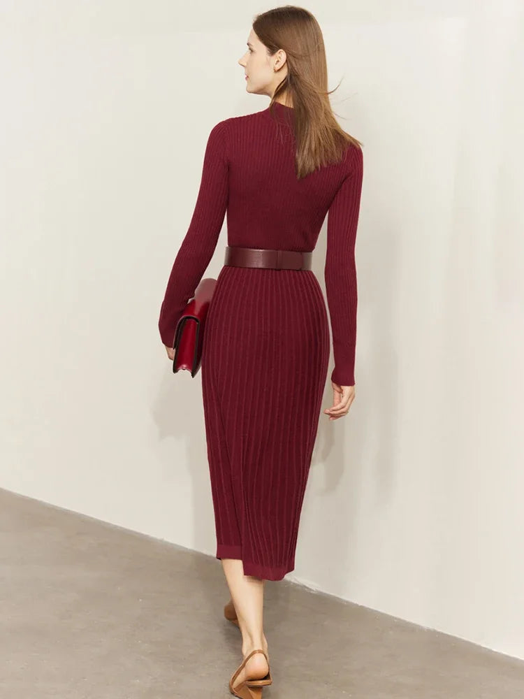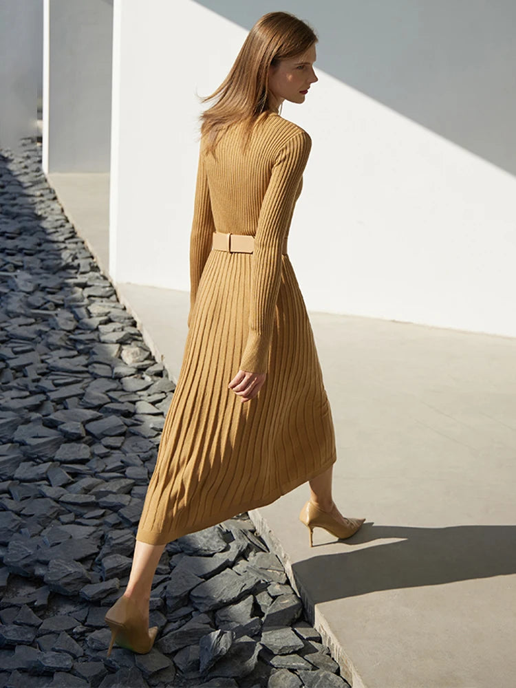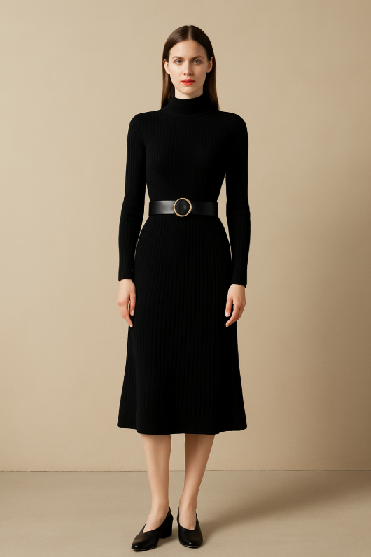• Elegancka dzianinowa sukienka midi z golfem, która podkreśla sylwetkę i dodaje klasy w biurowym wydaniu.